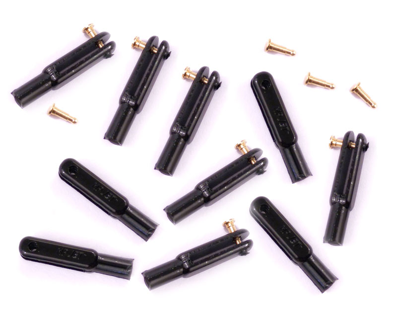 Вилка выполнена из нейлона, что гарантирует легкость и устойчивость к механическим повреждениям. Размеры изделия также полностью соответствуют стандартам, с длиной штифта в 23 мм и шириной дорожки для кабанчика в 1.6 мм. Резьба под тягу имеет стандартный диаметр M2, что обеспечивает универсальность и простоту в использовании. В упаковке представлены 10 штук, что позволяет иметь запас для выполнения различных задач.