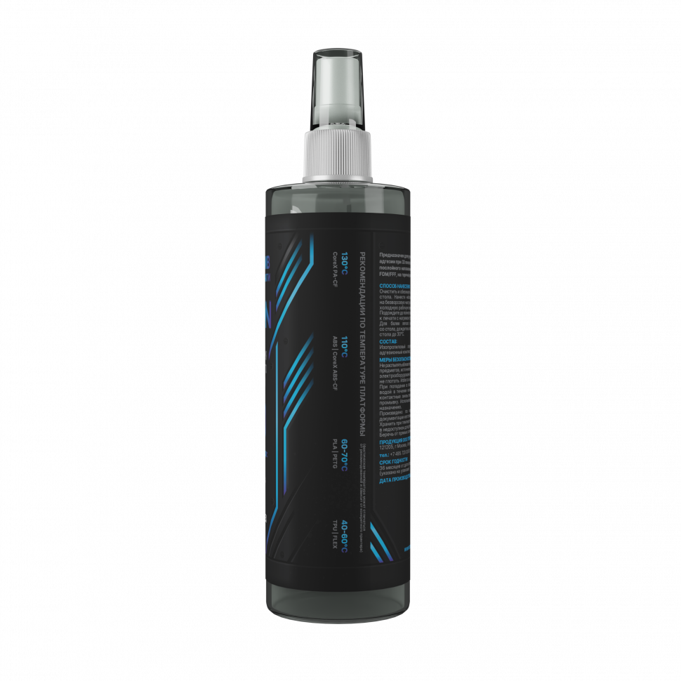 Клей-лак предназначен для создания адгезии между первым слоем модели и рабочего стола 3D-принтера. Работает только на горячем столе, при остывании поверхности на которую нанесен клей адгезия ослабевает и позволяет снять с печатного стола готовое изделие. Представляет из себя прозрачную жидкость на спиртовой основе, легко смывается водой.