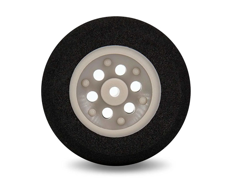 Покрышка колеса выполнена из плотного поролона, что обеспечивает отличное сцепление с поверхностью и хорошую амортизацию во время полета. Внешний диаметр колеса составляет 40 мм, что делает его подходящим для большинства стандартных моделей. Диаметр отверстия под ось шасси равен 2.5 мм, а ширина колеса — 12 мм, что гарантирует легкость установки и совместимость с разнообразными авиамоделями.