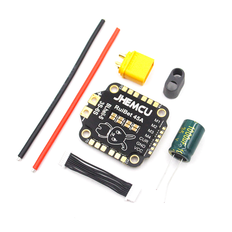 Регулятор комплектуется всем необходимым: кабелем 8p*1.0 мм, разъемом XT60 для подключения источника питания и конденсатором 1000 мкФ/35В для сглаживания пиковых нагрузок. Дополнительно в комплект входят два провода 16AWG, что позволяет легко интегрировать устройство в вашу модель. С JHEMCU RuiBet 45A вы сможете улучшить производительность вашего квадрокоптера и получить удовольствие от полетов.
