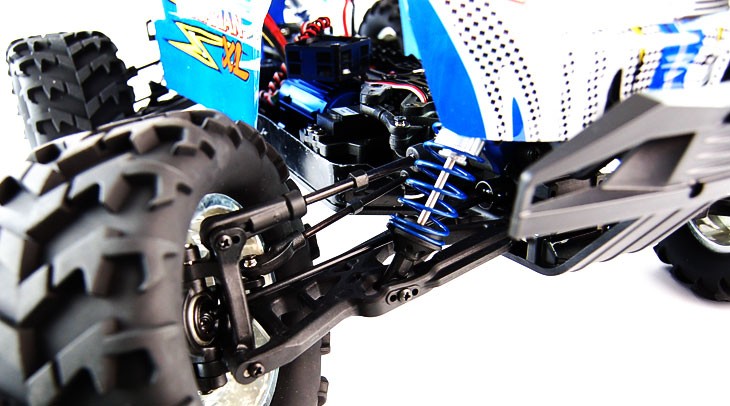 Улучшенная подвеска с амортизаторами диаметром 16 мм с алюминиевыми колпачками и регулируемые стабилизаторы поперечной устойчивости делают модель особенно устойчивой и управляемой как на асфальтовых, так и на неровных покрытиях. Специально разработанные конструктивные элементы, такие как жёсткое крепление двигателя и стальные шестерни, гарантируют высокую надёжность при активной эксплуатации. Кроме того, современная система рулевого управления с использованием С-хабов улучшает поворачиваемость и манёвренность, что позволяет наслаждаться динамичными заездами.