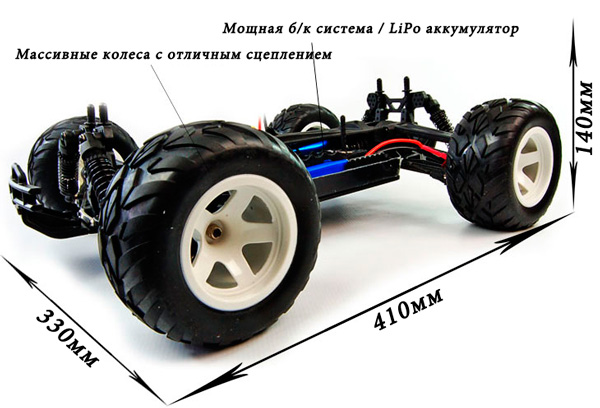 Модель оснащена продвинутыми техническими решениями: стальные карданные валы и привод на все четыре колеса гарантируют долговечность и надежность, в то время как колеса с протектором обеспечивают отличное сцепление с дорожным покрытием. Все шестерни выполнены из высококачественной стали, что значительно увеличивает срок службы устройства. Применение трех дифференциалов и подшипников в элементах ходовой части дополнительно улучшает характеристики модели. Сервопривод рулевого управления с высоким крутящим моментом и металлическими шестернями обеспечивает точность управления.