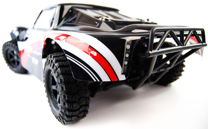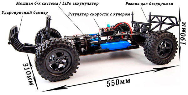 В комплекте с моделью вы получаете уже собранную и настроенную машину, аппаратуру управления на частоте 2.4 ГГц, аккумулятор LiPo 11.1 В с ёмкостью 2200 мАч и зарядное устройство. Для удобства использования необходимо дополнительно приобрести батарейки типа AA для передатчика.
