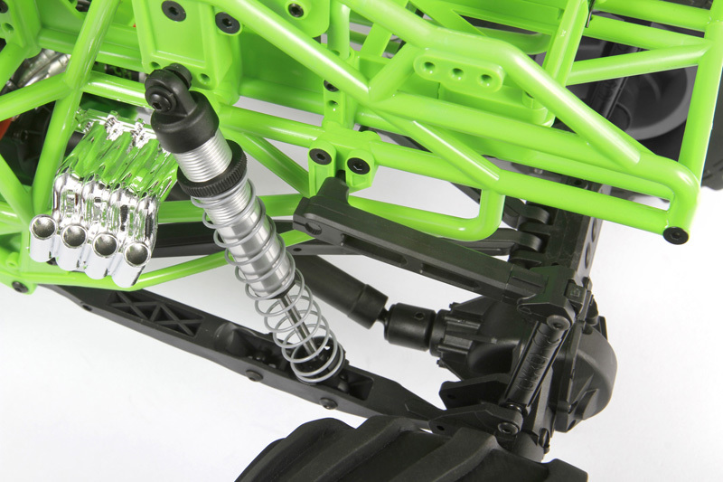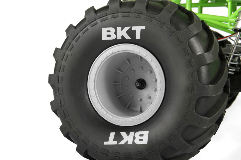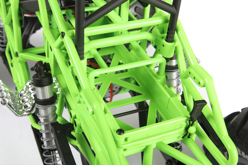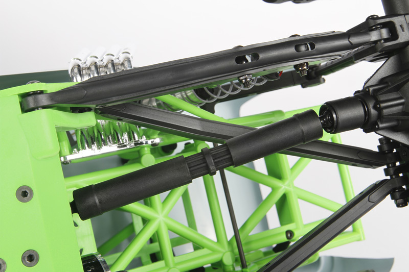 Внедорожник обладает прочной рамной конструкцией и таким же прочным карданным приводом на все колёса. Полностью независимая подвеска и регулируемые алюминиевые масляные амортизаторы обеспечивают отличную управляемость на различных поверхностях. Модель также комплектуется качественной резиной BKT 2.2", установленной на стильные серебристые диски с хабом 12 мм.