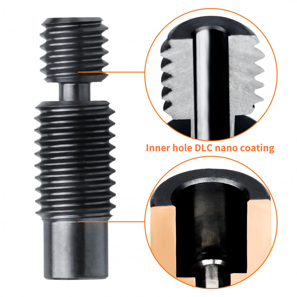 Специальное нанопокрытие DLC (Diamond-Like Carbon) придаёт термобарьеру дополнительные преимущества. Это покрытие обладает высокой износостойкостью, минимальным коэффициентом трения и отличной коррозионной стойкостью. Благодаря именно этому покрытию, внутренние стенки термобарьерa очень гладкие, что обеспечивает бесперебойное и плавное движение нити, исключая возможность засорения.
