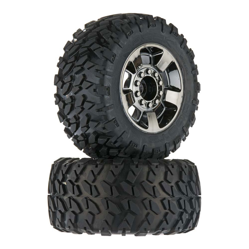 Комплект колес Dboots Ragnarok MT 6S включает в себя два высококачественных внедорожных колеса, предназначенных для радиоуправляемых внедорожников масштаба 1/8. Эти колеса имеют размер 3.8 дюйма и выполнены на стильных черных хромированных дисках. Их специально разработанная форма и глубокий протектор обеспечивают отличное сцепление с любыми поверхностями, что способствует высокой маневренности и устойчивости модели на сложных трассах.