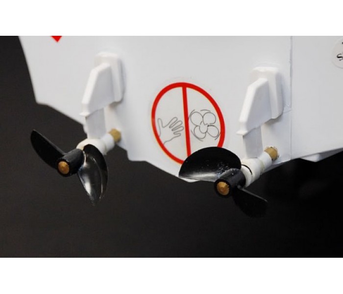 Управление катером осуществляется с помощью пульта на расстоянии до 150 метров, что открывает большие возможности для игры и экспериментов на воде. Время полной зарядки аккумулятора составляет 240 минут, что делает его простым в использовании.