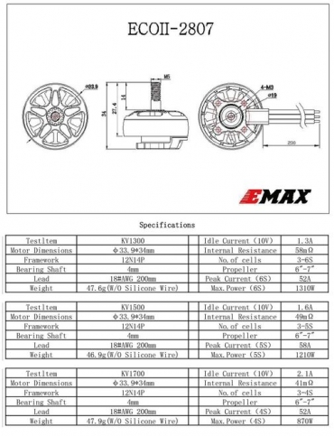 С данным электродвигателем вы сможете добиться высокой скорости и отличной маневренности вашего квадрокоптера. Компактные размеры и легкий вес позволяют установить двигатель на различные модели, не увеличивая общий вес аппарата. EMAX ECO II 2807 работает в диапазоне напряжений 3-4S, что обеспечивает большую гибкость при выборе батареи.