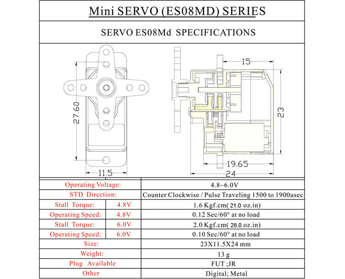 Особенностью модели ES08MD является наличие металлического редуктора, который обеспечивает долговечность и стабильную работу устройства, особенно в условиях активного использования. Хотя серво не обладает защитой от воды, его конструкция позволяет использовать его в различных условиях, где не требуется водонепроницаемость. Вес всего 13 граммов делает его идеальным для установки в легкие модели, не добавляя лишнего веса и не нарушая баланс.