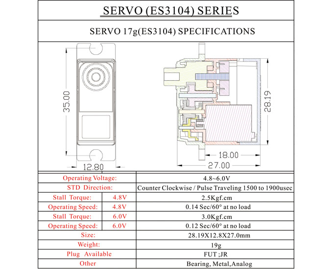 Необходимость в наличии подшипника в конструкции позволяет Emax ES3104 функционировать максимально эффективно и с минимальным количеством трения. При этом отсутствует защита от воды, что следует учитывать при выборе места эксплуатации модели. Используйте эту рулевую машинку для создания неповторимых и динамичных моделей, в которых требуется точное управление и высокая реакция.