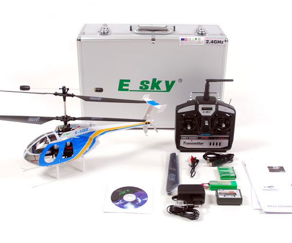 Esky E-500 поставляется в комплекте с полным набором необходимых аксессуаров, среди которых уже собранная модель вертолета, аккуратно настроенный приемник, зарядное устройство, запасной комплект лопастей, а также адаптеры для подключения к автомобильному аккумулятору и сети. Дополнительно в комплект входят батарейки для пульта управления и инструкция на английском языке, что облегчает процесс освоения устройства.