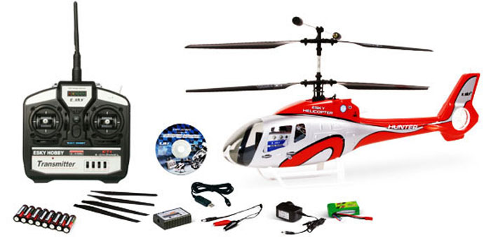 Esky Hunter предлагает стильный копийный корпус с габаритным огнем, который добавляет эстетическую привлекательность. Также в комплект входят запасные лопасти и симулятор полетов, что позволяет новичкам тренироваться даже без выхода на улицу. Вертолет обладает возможностью зарядки от источника питания 12В, что делает его использование более удобным.