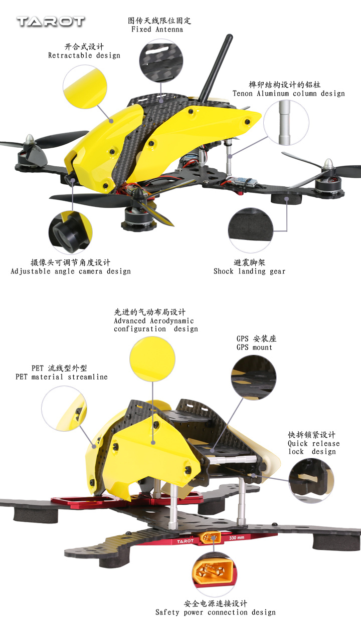 Каждая деталь рамы продумана до мелочей, что позволяет легко инсталлировать различные компоненты: от камер до систем передачи видео. Удобные крепления обеспечивают надежное фиксирование, а также возможность быстрой замены элементов при необходимости. С рамой FPV квадрокоптера Tarot 330 ваш опыт полетов станет более увлекательным и беспечным, позволяя сосредоточиться на главном – управлении и получении удовольствия от полетов.