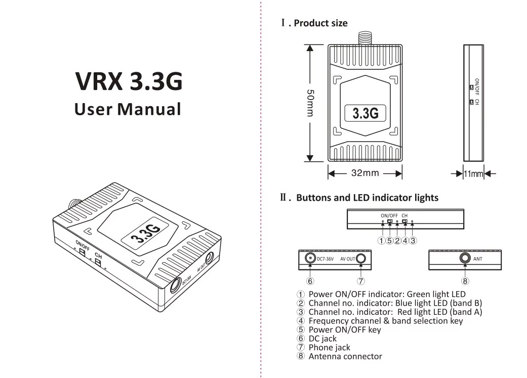 FPV видеоприемник VRX 3,3G — это надежное и высококачественное устройство, предназначенное для приемки видео с радиоуправляемых моделей. С его помощью пользователи могут наслаждаться стабильным и четким изображением, что особенно важно при пилотировании квадрокоптеров и других моделей. Видеоприемник поддерживает 8 каналов, что предоставляет возможность выбора оптимального канала для работы, обеспечивая превосходное качество передачи сигнала даже на дальних дистанциях.