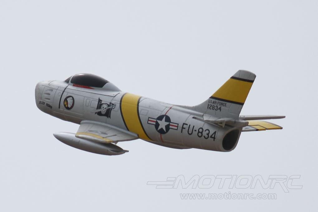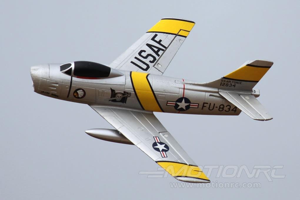 FreeWing F-86 Sabre изготовлен с учетом деталей оригинала и включает электродвигатель 2627-4300Kv, что обеспечивает отличное ускорение и высокую скорость. Регулятор оборотов мощностью 30A и три сервомашинки по 9 г позволяют обеспечить точное управление и реагирование на команды пилота. Модель поставляется в готовом к полетам виде, но для полноценного использования необходимо приобрести аппаратуру управления с минимум тремя каналами, а также LiPo аккумулятор напряжением 11,1 В с емкостью 1600-1800 мАч и зарядное устройство.