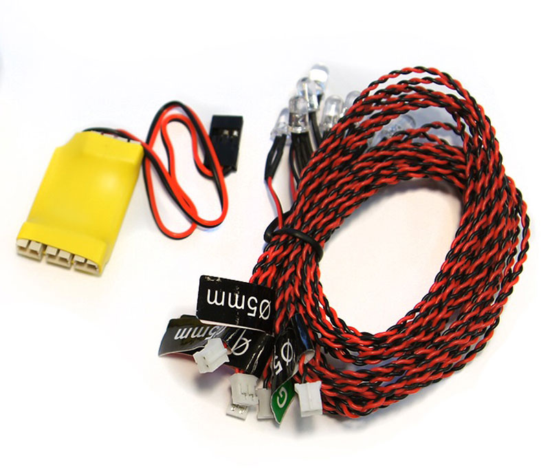 - Комплектация: контроллер, 2 мощных белых светодиода, 1 мощный красный светодиод, 1 мощный зеленый светодиод, 2 белых светодиода стробоскопа, 2 красных светодиода с медленной вспышкой