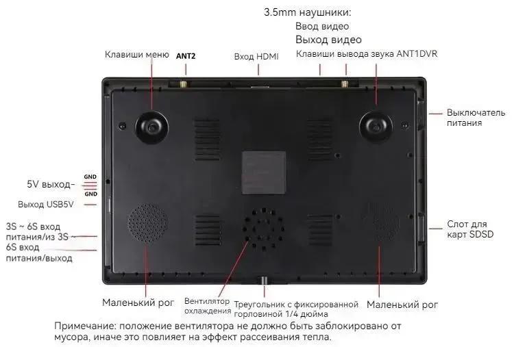 Кроме того, устройство поддерживает любые видеосигналы в форматах PAL и NTSC и может автоматические переключаться между ними. Время работы от аккумулятора составляет приблизительно 1,5 - 2 часа, с возможностью подключения батарей с напряжением от 3S до 6S. Gнедиевом видеовыход включает 3,5-мм разъем, который подходит для подключения к очкам DJI, а также доступны HDMI и аналоговые входы, что обеспечивает разнообразие вариантов использования.