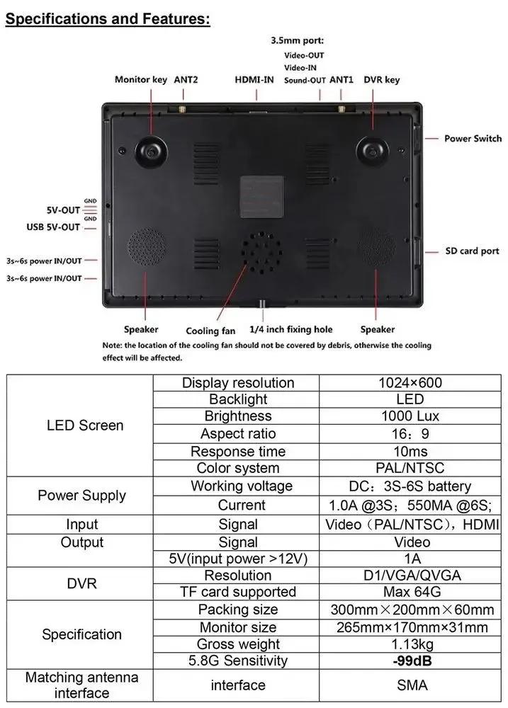 Монитор оснащен 10,2-дюймовым IPS-дисплеем с разрешением 1280 x 720 и яркостью в 10000 люкс, что обеспечивает качество изображения и удобство просмотра. Среди дополнительных функций можно выделить наличие индикатора напряжения на экране, таймера и отображение сигнала RSSI, что позволяет пользователю получать актуальную информацию о состоянии подключения.