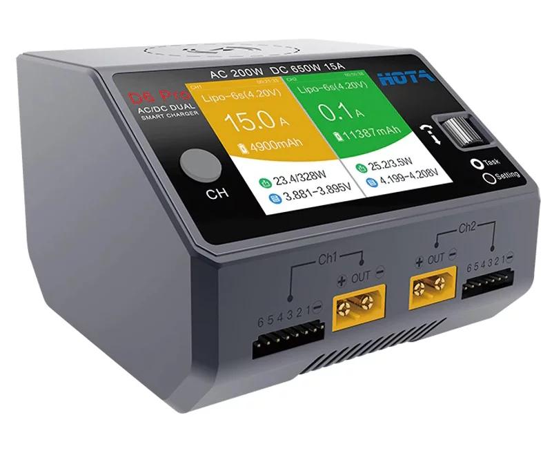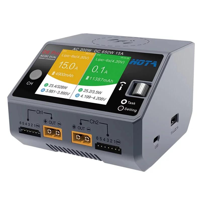 HOTA D6 Pro — это интеллектуальное зарядное устройство для различных типов аккумуляторов, которое можно запитывать как от постоянного тока, так и от сети переменного тока.