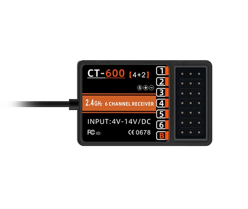 Аппаратура оснащена приемником CT-600 4+2, что дает возможность управлять до шести каналов, что делает её идеальным выбором как для начинающих, так и для опытных моделистов. Удобная и эргономичная форма пульта обеспечивает комфорт во время длительного использования, а интуитивно понятный интерфейс позволяет быстро освоить все функции.