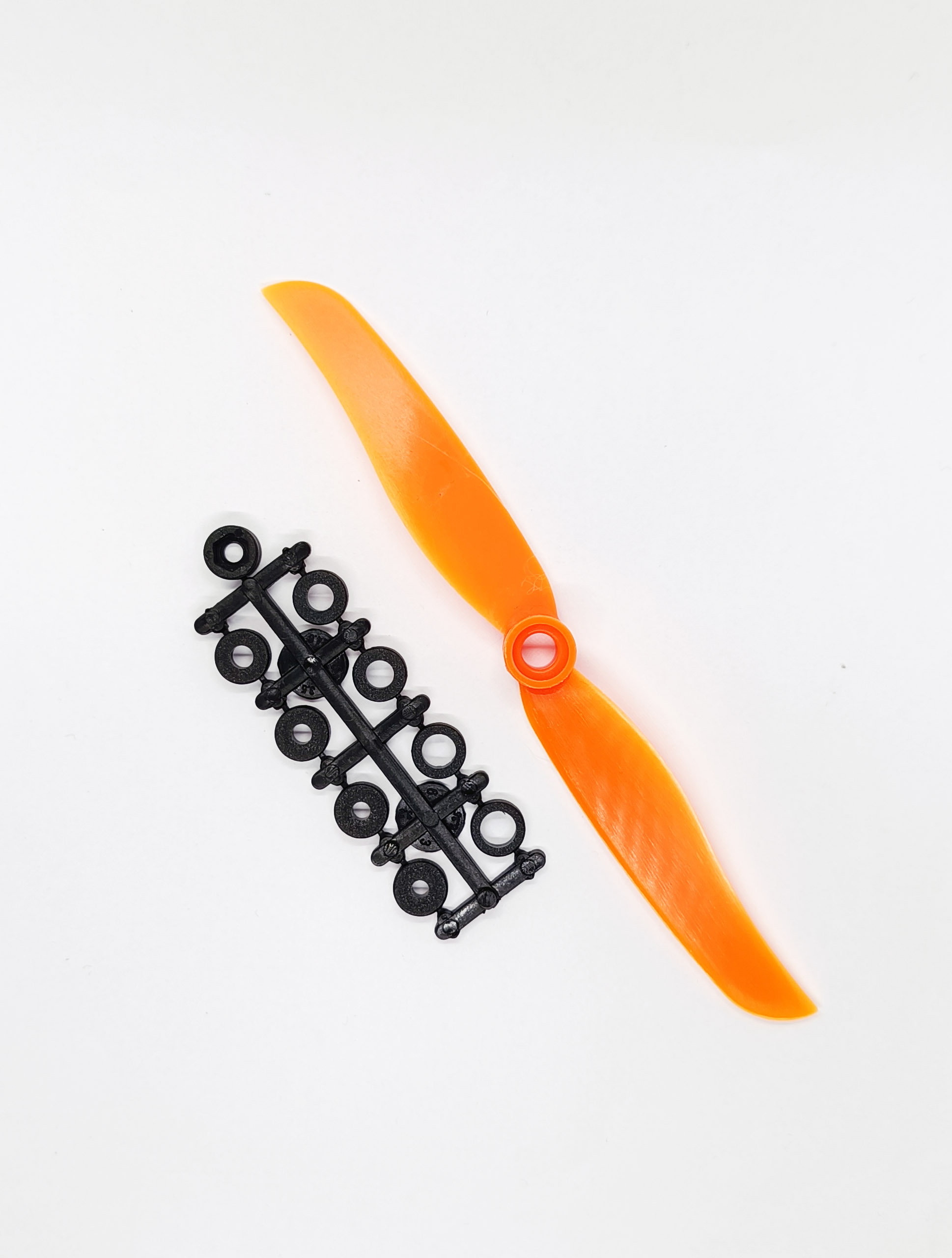 Пропеллер выполнен из нейлона, что обеспечивает ему высокую прочность и устойчивость к механическим повреждениям. Оранжевый цвет делает его заметным в воздухе, что особенно важно при полетах на открытых территориях. Установочный диаметр отверстия равен 1/4 дюйма (6 мм) и совместим с различными адаптерными кольцами, которые идут в комплекте. В комплекте представлены кольца следующих размеров: 3 мм, 3.17 мм, 3.5 мм, 4 мм, 4.8 мм, 5 мм, 6 мм и 6.35 мм. Это обеспечивает легкую установку и универсальность использования пропеллера с различными моторами.
