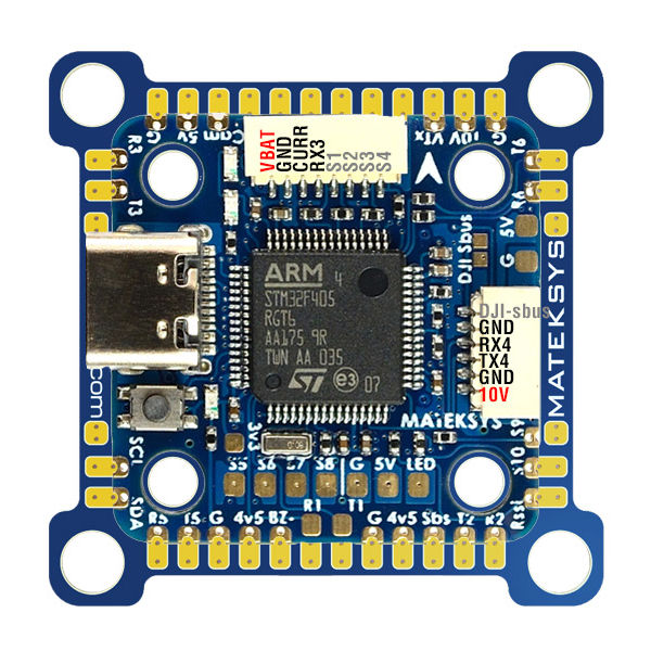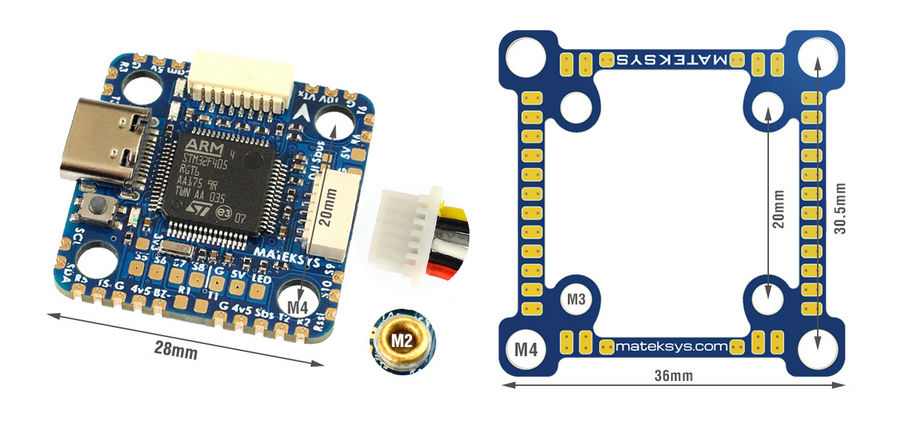 - Комплект поставки: FC F405-miniTE, переходник 20мм-30.5мм, 6 силиконовых проставок M4-M3, 6 медных проставок M3-M2, 8p кабель 50мм, 6p - GH1.25 8p кабель 80мм для DJI Air Unit