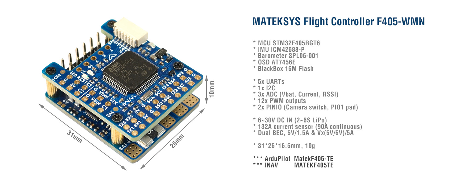 Полетный контроллер Matek F405-WMN — это надежное и мощное решение для управления беспилотными летательными аппаратами. Разработанный на базе процессора STM32F405RGT6 с тактовой частотой 168 МГц, данный контроллер сочетает в себе высокую производительность и функциональность. Встроенная память объемом 1 МБ позволяет эффективно хранить настройки и прошивки, а для черного ящика предусмотрено 16 МБ Flash памяти.