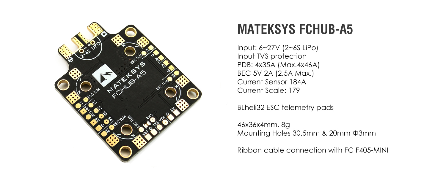 Плата MATEKSYS FCHUB-A5 с датчиком тока 184A — идеальное решение для пользователей, стремящихся повысить эффективность своих квадрокоптеров и радиоуправляемых моделей. Этот компонент обеспечит надежное и стабильное питание, что особенно важно для выполнения различных задач, требующих высокой производительности и точности.