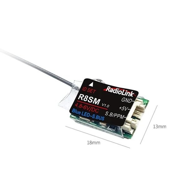 R8SM легко подключается к аппаратуре управления RadioLink, включая модели T8S, T8FB, RC4GS, RC4GS V2, RC6GS и RC6GS V2. Минимальный вес в 2 грамма и компактные размеры (18x13 мм) позволяют устанавливать приемник даже в небольшие и легкие модели, не значимо увеличивая их вес. Кроме того, рабочее напряжение устройства составляет от 4.8 до 6 В, а ток потребления находится в пределах 38-45 мА при 5 В, что обеспечит необходимость в экономичном использовании энергии.