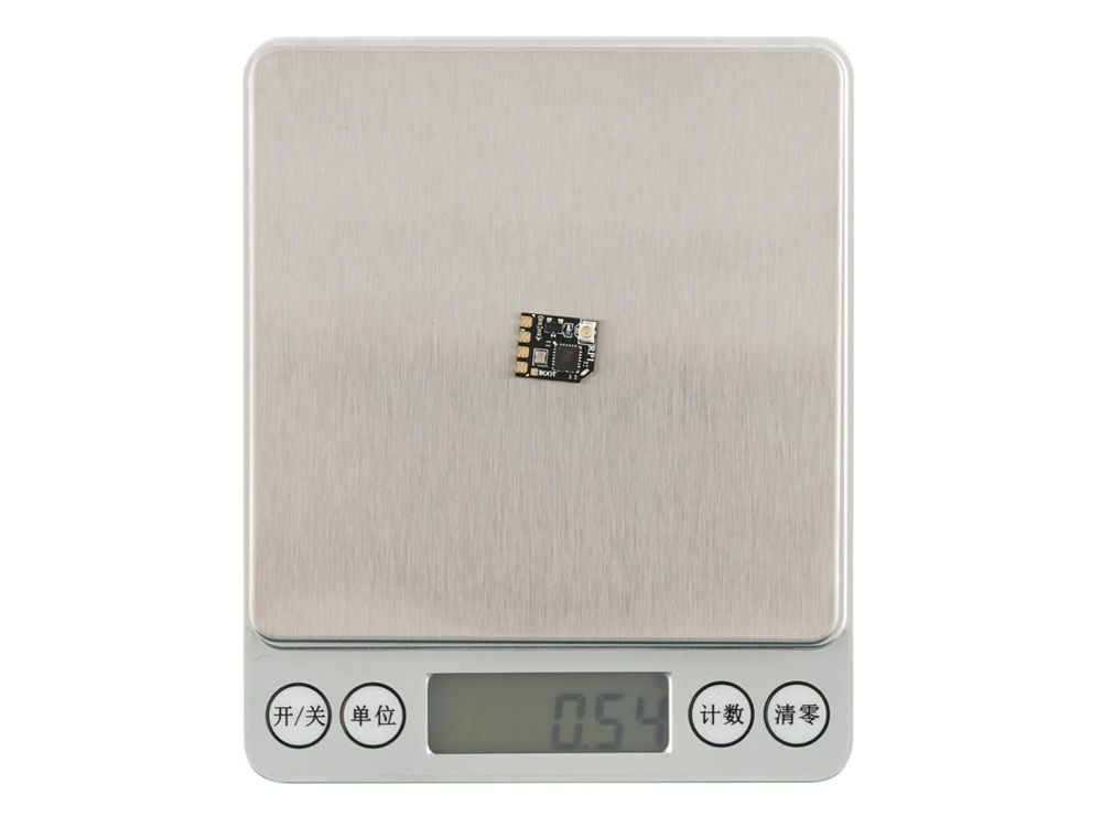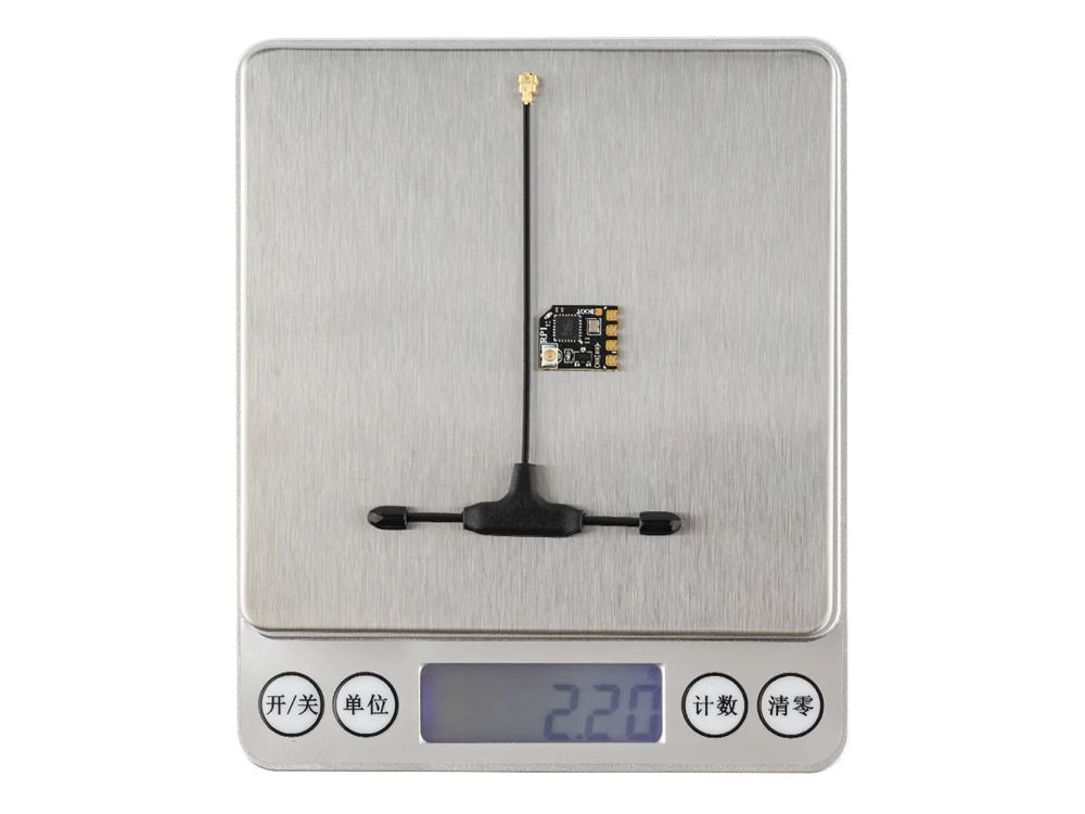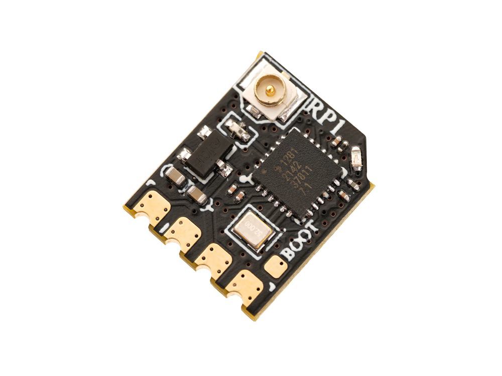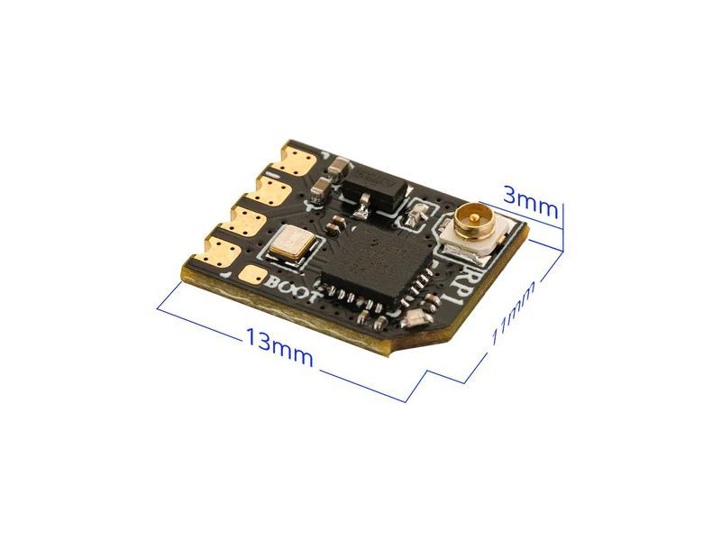 Приемник также комплектуется жесткой антенной длиной 65 мм, что обеспечивает надежную связь на расстоянии. С технической стороны, устройство обладает следующими характеристиками: микроконтроллер на базе ESP8285, радиомодуль SX1280IMLTRT, работающий в диапазоне частот от 2400 до 2480 МГц. Приемник поддерживает максимальную частоту передачи до 500 Гц, а минимальную до 25 Гц. Напряжение питания составляет 5V, а вес устройства без антенны - 0.53 г. Размеры приемника составляют 13х11х3 мм.