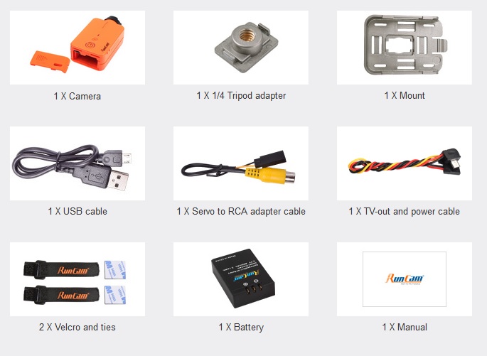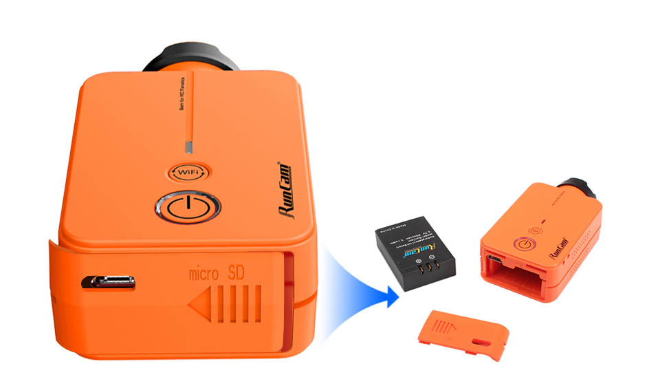 Runcam 2 выполнена с учетом современных требований, и её компактные размеры (66мм x 38мм x 21мм) позволяют легко транспортировать камеру, а легкий вес в 49 грамм с батареей не создаст никаких неудобств. Батарея ёмкостью 850 мА обеспечивает продолжительное время работы, а возможность ручного или автоматического поворота изображения на 180° добавляет гибкость в процессе использования.