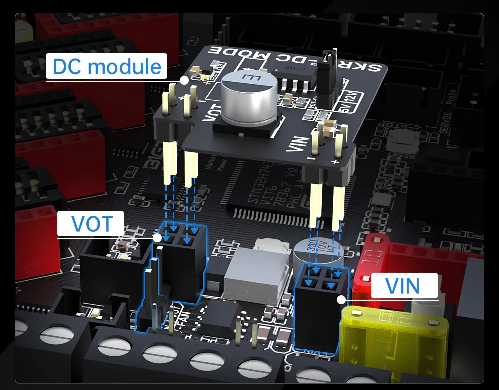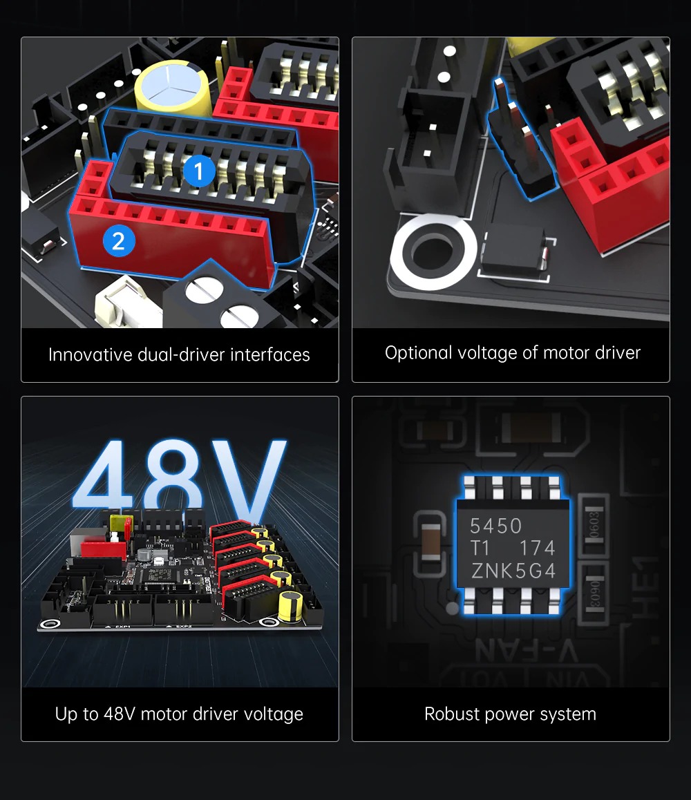 Одним из ключевых преимуществ является возможность подключения вентиляторов с различным напряжением, что позволяет эффективно использовать питание без дополнительных преобразователей. Плата также поддерживает высокоточные термисторы PT1000, упрощая настройку для кастомных сборок. Встроенные функции, такие как возобновление печати, обнаружение филамента и включение BLTouch, делают использование платы простым и удобным. Дистанционное управление возможно с помощью дополнительных WIFI-модулей, что обеспечивает гибкость в управлении 3D-принтером.