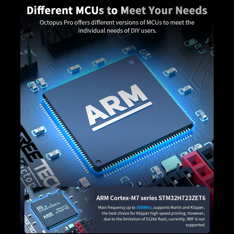 BIGTREETECH Octopus Pro V1.1 — это высокопроизводительная материнская плата для 3D-принтеров, предназначенная для профессионалов и любителей, стремящихся к совершенству в печати. Оснащенная мощным чипом STM32H723ZE, работающим на тактовой частоте до 168 МГц, и 1 МБ флеш-памяти, эта плата обеспечивает стабильную и быструю работу с большинством доступных прошивок.