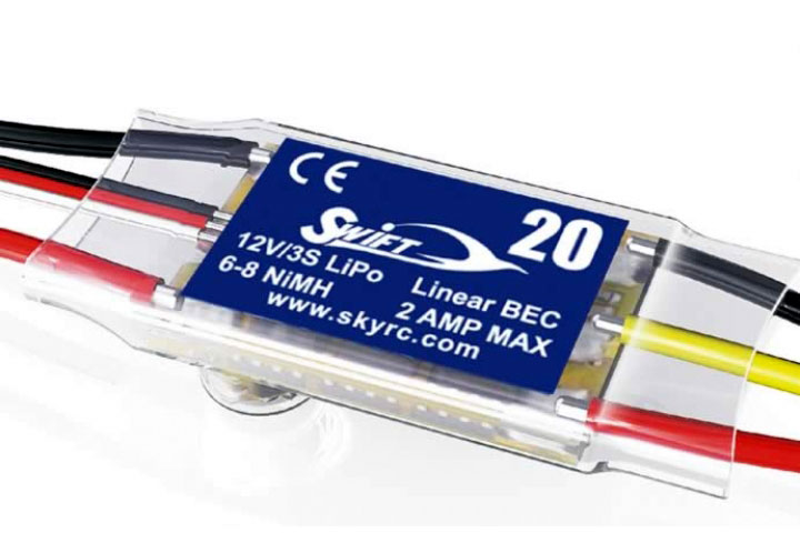 SkyRC Swift 20A представляет собой высокоэффективный регулятор оборотов, специально разработанный для авиамоделей с бесколлекторными двигателями. Этот продукт сочетает в себе простоту использования, надежность и доступность, что делает его идеальным выбором как для опытных моделистов, так и для новичков. Максимальный ток, который может выдавать регулятор, составляет 20А, что обеспечивает стабильную работу моделей даже при высоких нагрузках.