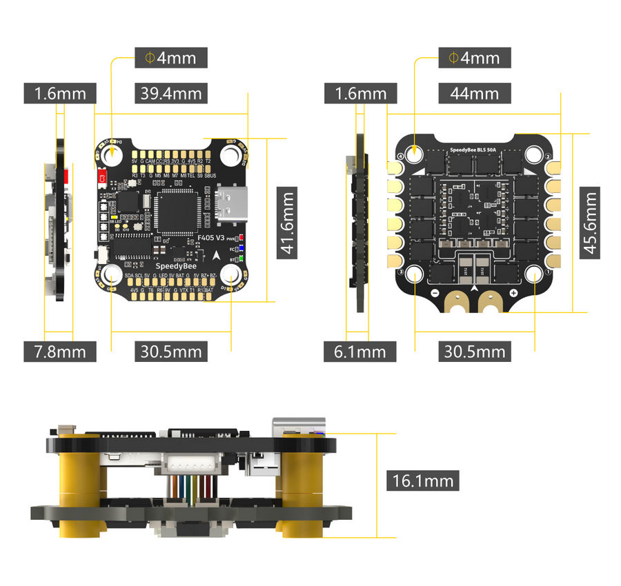 SpeedyBee BLS 50A ESC, входящий в комплект, также обладает высокими техническими характеристиками: он поддерживает пиковый ток в 55А и оснащен TVS диодом для защиты от перенапряжений. Протокол DSHOT300/600 обеспечивает надежную и быструю связь с моторами.