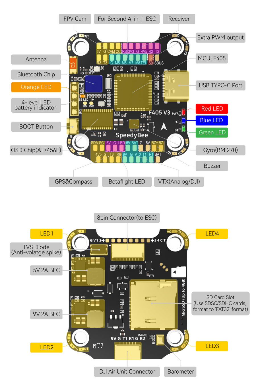 SpeedyBee F405 V3 – это продвинутый полетный контроллер, который идеально подходит для радиоуправляемых моделей и квадрокоптеров. Он сочетает в себе высокую производительность и множество функциональных возможностей, что делает его незаменимым инструментом для любителей FPV. Уникальная особенность этого контроллера – беспроводная настройка по Bluetooth, что позволяет быстро и удобно вносить необходимые изменения без использования проводов.