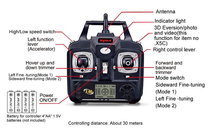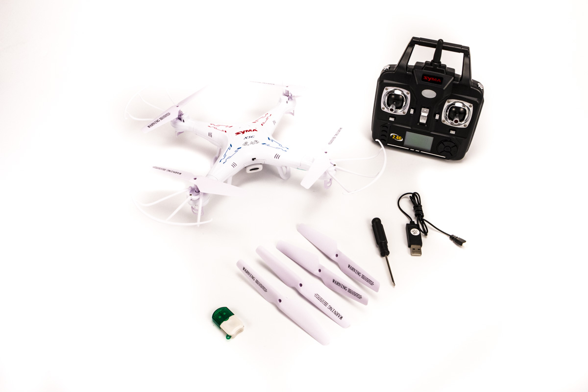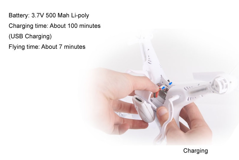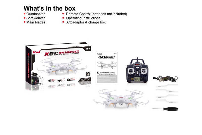 В комплекте с квадрокоптером идут все необходимые аксессуары: установленная камера, аппаратура радиоуправления, аккумулятор LiPo, USB зарядное устройство, запасные пропеллеры и защита пропеллеров. Для полноценной работы понадобится только 4 батарейки типа AA для передатчика.