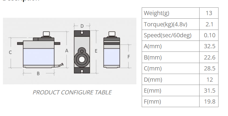- Момент остановки: 2,1 кг/см (4,8 В), 2,4 кг/см (6,6 В)