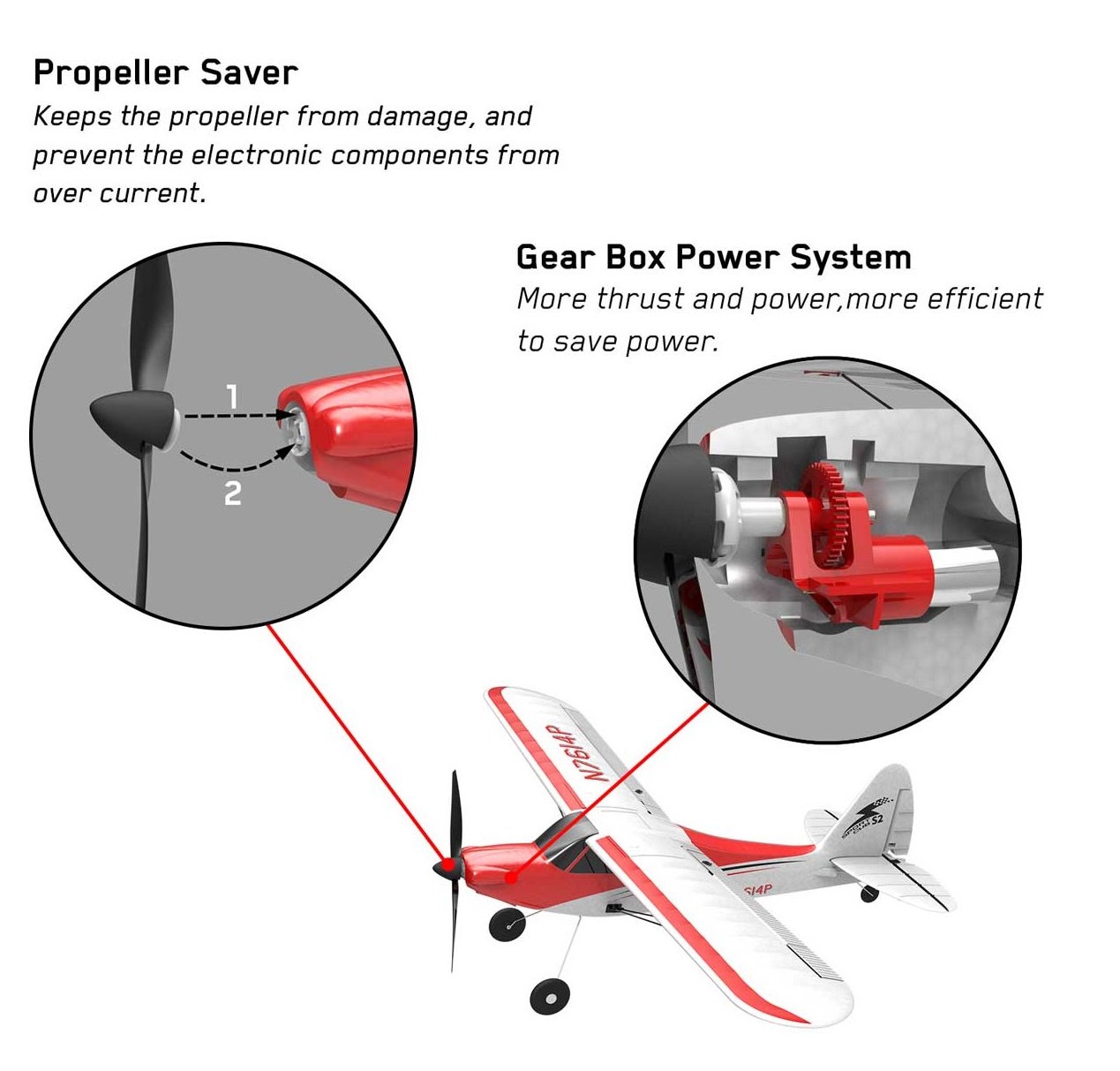 К конструкции данного самолета применен прочный и легкий материал EPP, который обеспечивает устойчивость к повреждениям при столкновениях и посадках. Удобный толкательный механизм защищает воздушный винт от ударов, позволяя длительное время наслаждаться полетом. Мощный мотор обеспечивает высокую производительность, и при правильном использовании самолет может находиться в воздухе до 20 минут – что является отличным показателем для данного класса моделей.