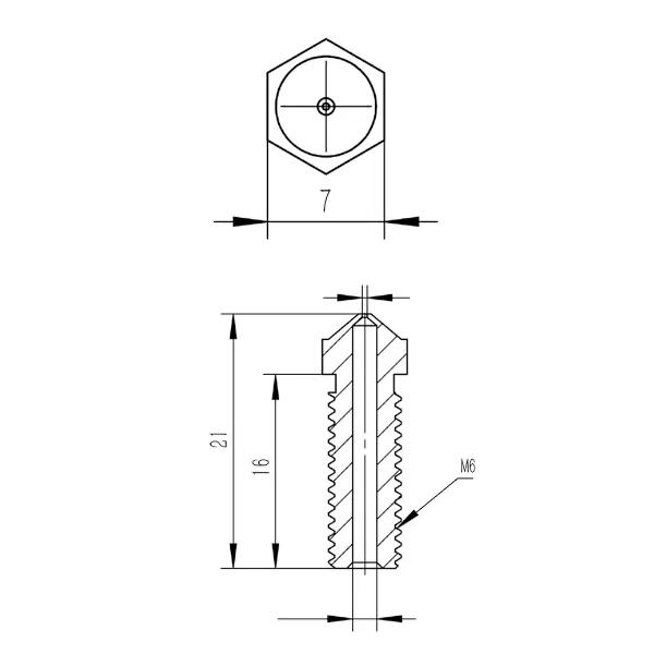 Сопло Volcano имеет размеры 21х7 мм и резьбу М6, что упрощает установку и демонтаж. Латунный материал гарантирует долговечность и устойчивость к высоким температурам, что особенно важно в процессе 3D-печати.
