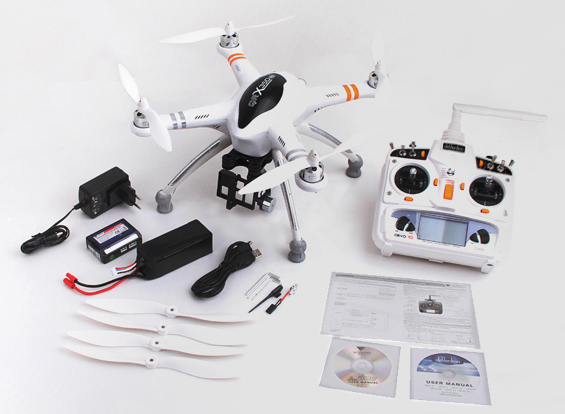 - Комплект поставки: квадрокоптер, пульт управления, 2-х осевой подвес, аккумулятор для квадрокоптера, запасные лопасти, зарядное устройство, инструменты.