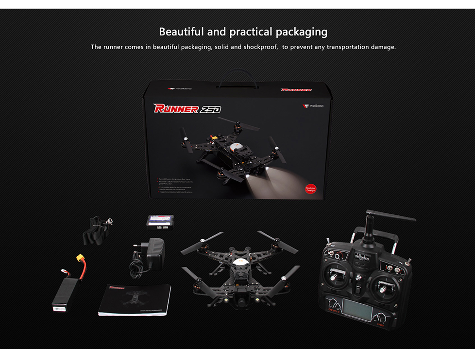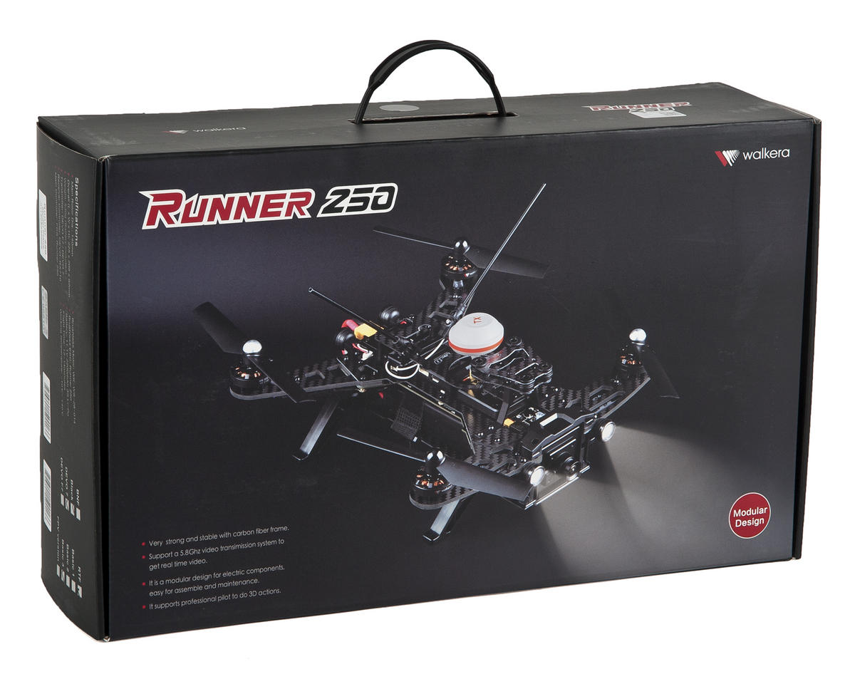 Купив Walkera Runner 250, вы получите все необходимое для старта: квадрокоптер с моторами и регуляторами, пульт управления, видеокамеру, систему OSD, зарядное устройство и аккумулятор. Тем, кто хочет попробовать свои силы в FPV гонках, стоит отдельно приобрести видеоприемник и видеоочки.